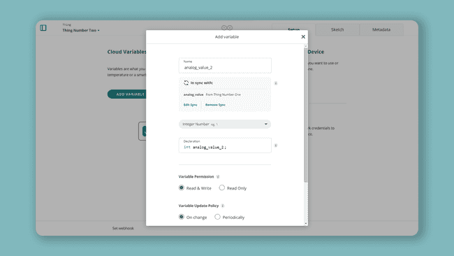 Next, we can repeat the same process for the boolean variable, but instead of selecting the analog_value variable to sync with, select the boolean_sync variable. Now we should have two variables that are synced with our other Thing.
